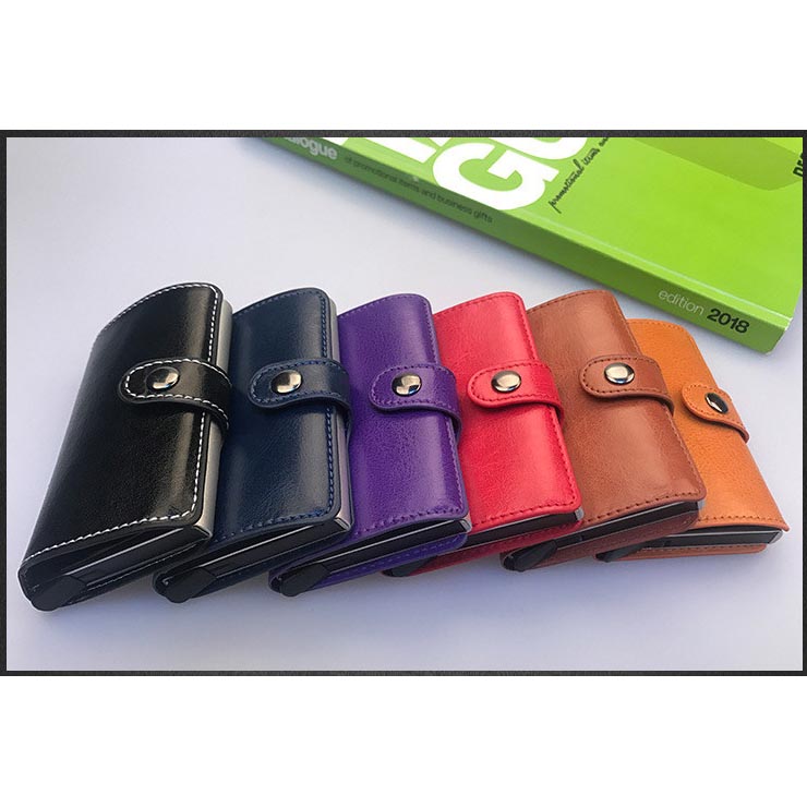 Gyda dyluniad tenau chwaethus a lluniaidd, mae deiliad y cerdyn hwn yn amlygu ceinder a chyffyrddiad o swyn retro. Mae ei gynllun ymarferol yn cynnwys adran blwch metel wedi'i actifadu gan fotwm alldaflu, sy'n gallu cynnwys tua 5-6 cerdyn. Yn ogystal, mae dwy boced yn y waled yn cynnig lle ar gyfer cardiau eraill fel trwyddedau gyrrwr, cardiau yswiriant, ochr yn ochr ag adran arian parod fach, gan ddarparu ymarferoldeb popeth-mewn-un ar gyfer eich hanfodion.